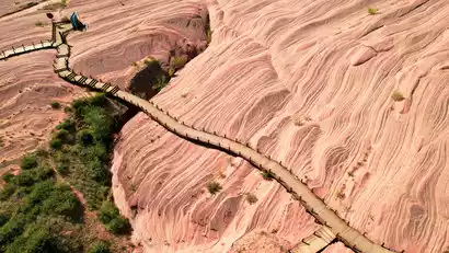 We'll head to the main scenic area of Wave Valley, also known as Longzhou Danxia. Here, the red rocks flow like a stream, cascading down the ravine in circles, lumps, and curves. These red rocks, frozen in the water, resemble tiny streams flowing at the bottom of the ravine and the green vegetation in the distance, creating a beautiful, immersive scene. This magnificent Danxia oasis will surely captivate you, leaving you in awe of the passage of time.