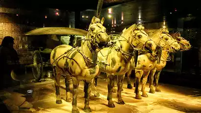 The construction of the Mausoleum of the First Qin Emperor took 39 years and over 700,000 workers. Its total area is 56.25 square kilometers, equivalent to the size of 78 Forbidden City palaces. Surrounding the mausoleum are numerous burial pits and tombs of varying shapes and contents, with over 400 discovered. We'll tour the mausoleum in an electric vehicle, exploring the bronze chariots and horses, known as the "Crown of Bronze," marvel at the craftsmanship of Qin Dynasty bronzeware, and witness the rich entertainment life of the Qin court in the K9901 burial pit, the Hundred Plays Terracotta Warriors Pit. The K0006 Civilian Officials Terracotta Warriors Pit is a rare relic within the mausoleum that has remained untouched by fire.