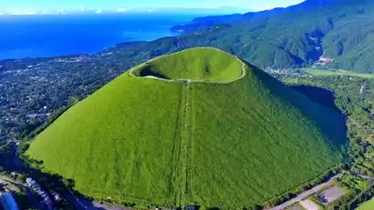 Mount Omuro was formed by volcanic eruptions thousands of years ago, creating the unique landscape of the Izu Plateau. Its summit is conical, and within it lies a vast crater, forming a graceful curve resembling an inverted bowl. The mountain is lushly green, and visitors can ascend to the summit via a cable car. From the summit, they can enjoy breathtaking views of the Amagi Mountains, Mount Fuji, and the surrounding Izu Oshima Island. As a filming location for the movie "Your Name," the mountain is a popular destination for moviegoers.