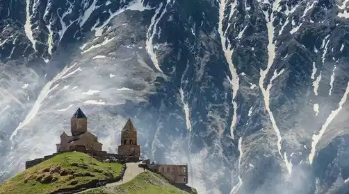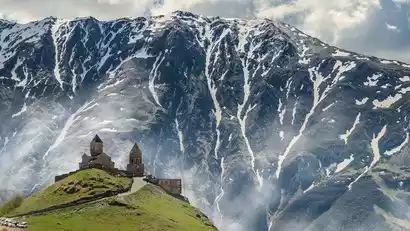 We'll board a 6-7-seater minivan to Holy Trinity Church. The church offers a panoramic view of Kazbegi, with the entire village at our feet, allowing you to experience the magnificent Caucasian scenery. Legend has it that long ago, in Georgian legend, a god similar to Prometheus stole divine fire from heaven and brought it to Earth. As punishment, the gods imprisoned him in a cave atop Mount Kazbegi.