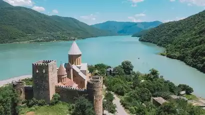 Travel to the renowned Kazbek region of the Caucasus, and along the way, admire Ananuri Castle, the riverside castle featured on the cover of "Lonely Planet: The Three Kingdoms of the Transcaucasus." Today, the castle has become one of Georgia's most iconic landmarks, attracting countless visitors to this magical and beautiful land. Nestled mid-mountain, the castle's emerald-colored waters, Aragvi Lake, complement the castle's green dome. Beyond, the majestic Transcaucasian Mountains frame the surrounding landscape, a scene of classicism and beauty captured to the fullest.