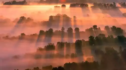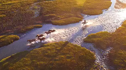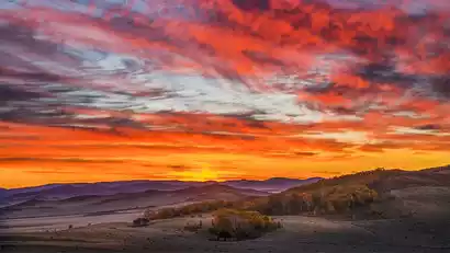 Get up early and drive to [Toufenggou] to shoot the sunrise. This is a new shooting spot deep in the grassland. The canyon river meanders eastward from the grassland. The white birch trees wither but do not fall in the water. Scattered in the middle are grassland villages, rivers, sandy land and other landscapes with rich layers.