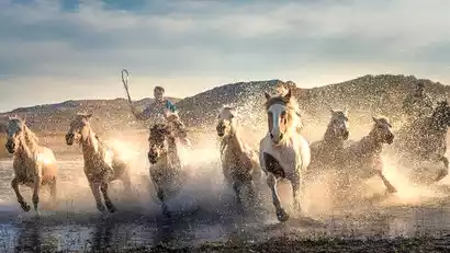 Get up early and head to Jiangjun Paozi to photograph the sunrise, morning mist, and reflections. The water here is vast and surrounded by mountains. It is one of the golden spots for photographing the sunrise on the dam, and it is also a place for photography enthusiasts to take pictures of horses stepping on the water.