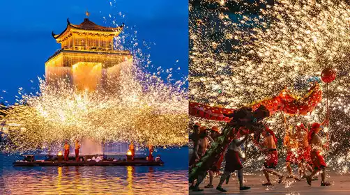 At night, don’t miss the “Five Golden Lights” water curtain show, the intangible cultural heritage of iron flower making, and the fireworks show.