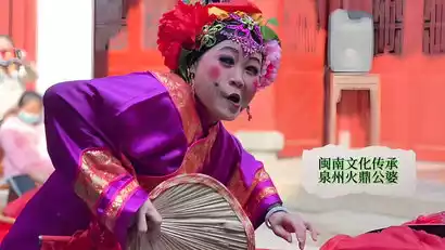 The Huo Ding Gong Po (fire tripod mother-in-law and mother-in-law) is a Quanzhou folk parade. Its passionate and humorous dance routines, coupled with the interactive nature of the intangible cultural heritage performers, have made it a popular folk performance. To make the "Huo Ding Po" look even more realistic and comical, the intangible cultural heritage teacher not only applies heavy makeup but also adds two "spider" moles, symbolizing "contentment is happiness." She also wears exaggerated flowers and wide-sleeved, wide-legged blouses and pants. With a wave of a cattail leaf fan and a dance move, she instantly transforms into the playful "Huo Ding Po."