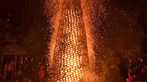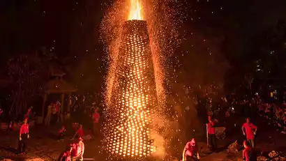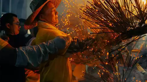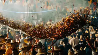 In the evening, we'll visit the Burning Grain Tower folk custom in Longtou Ancient Village, Tanbu Town, Guangzhou. Burning the Grain Tower is a traditional Tanbu town custom with a history stretching back thousands of years. Before the Mid-Autumn Festival, villagers build the tower and prepare firewood and hay inside. At night, they ignite the fuel, allowing the flames to burn brightly within. During the burning process, they sprinkle coarse salt and other fuels to intensify the flames. They also use long bamboo poles to stir the hay and other fuel toward the tower's mouth, causing sparks to erupt from the surrounding area toward the top, creating a beautiful blaze. When the tower burns, the flames reach several meters high, illuminating the sky with a vibrant crimson glow. Local villagers and tourists flock to witness this spectacular traditional custom. Burning the Grain Tower embodies the villagers' wishes for a prosperous and fulfilling life in the coming year. The higher and more vigorous the flames burn, the more prosperous and fulfilling they are, symbolizing a prosperous and flourishing life in the coming year.