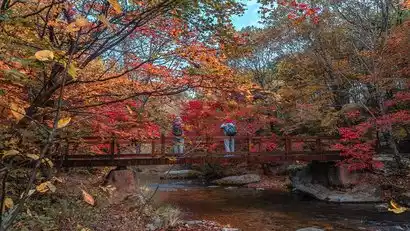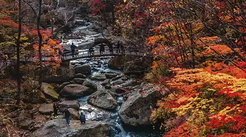 After breakfast, we'll depart for Tianqiaogou National Forest Park. While less famous and less visited than Guanmenshan, Tianqiaogou boasts equally stunning autumn scenery. The mountains are tranquil and shady, with springs flowing through streams and vibrant autumn leaves blanketing the landscape. After a satisfying visit, we'll depart and head to Kuandian County for the night.