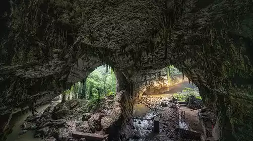 The twin caves created by the unique landform appear in the same scene, and the backflowing river gurgles continuously, highlighting the wonder and uniqueness of this place;
