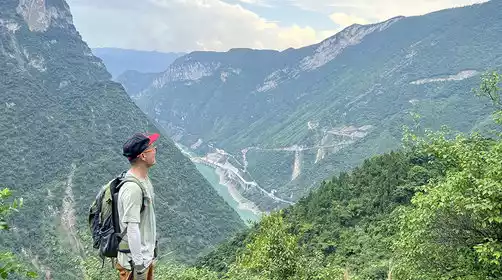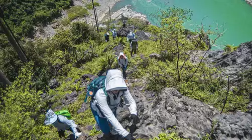 When we arrived at the hiking point, we put on our backpacks, took a boat across the river, and started walking along the mountain wall, paying attention to safety and moving forward steadily; when we reached the foot of the mountain, we started climbing up (there was no retreat point along the way).
