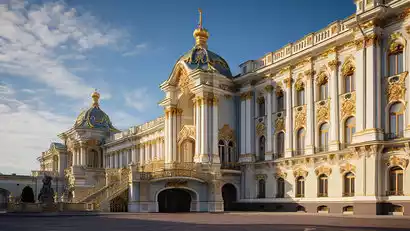 After lunch, we'll proceed to the Catherine Palace (enter). The two-story palace boasts a facade stretching over 300 meters. Its primary colors are blue, white, and yellow, said to represent the queen's blue eyes, white skin, and golden hair. The Amber Room, adorned throughout with amber and gold, is magnificent, showcasing the ingenuity of German and Russian craftsmen.