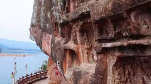 Arrive at Dongfeng Weir-Qianfoyan Scenic Area, travel through time and space to talk with the thousand Buddha statues on the cliffs facing the river, and admire the world's irrigation project site - Dongfeng Weir