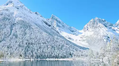 In winter, Bipenggou is transformed into a world of ice and snow, with snow-capped mountains and lakes, emerald green and gilded frost.