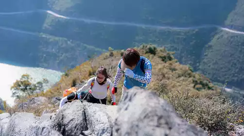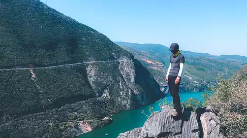 After reaching the turning point, start walking along the mountain wall, pay attention to safety and move forward steadily;