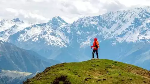 Alpine pasture, surrounded by snow-capped mountains, with a very wide view and a full hiking experience