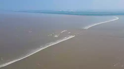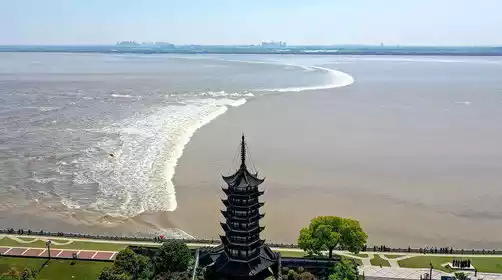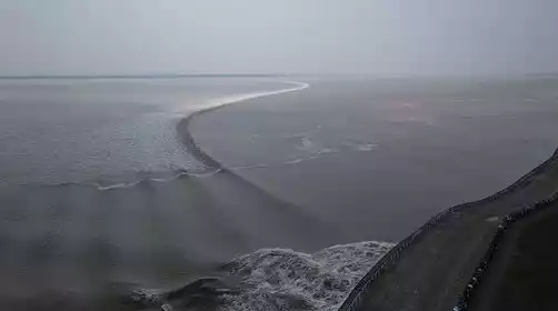 The spectacular Qiantang River tides are caused not only by the gravitational pull of the moon and sun, but also by the trumpet-shaped shape of the Qiantang River's estuary. When a large amount of water surges in from the Qiantang River's estuary, the river's surface shrinks rapidly, preventing the tide from rising evenly. Consequently, the waves behind push against the waves in front, which can't move quickly enough, allowing the waves behind to catch up, creating a layer upon layer of water.