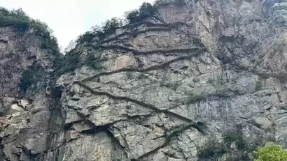 Around 10:15, we descended the Ant Staircase, a treacherous path from the top of Chiyan Gorge to the bottom. Due to its steepness and difficulty, it's called the Ant Staircase, a reference to the path ants use. Walking on the Ant Staircase, you're faced with a hundred-foot-deep cliff, and every step is terrifying, requiring extreme caution and careful use of both hands and feet. After descending the Ant Staircase, you can admire the canyon scenery along the path at the bottom. Continuing south along the trail, you'll reach the Henan border. Before the highway was opened, the Ant Staircase served as the only link between Xiyagou and Henan. It's now a popular route for hiking enthusiasts.