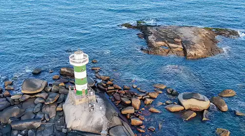 Follow the coastline to Shuangmianhai, a unique spot on Dongshan Island known for its "double-sided sea." At high tide, the waters on both sides surge up, competing with each other, submerging the sandy beach in the middle, creating a scene of the sky. At low tide, a navigable sandbar appears at Nanmen Bay. After low tide, you can walk along the double-sided beach to Nanyu Island, a magical path that emerges with the ebb and flow of the tide. Nanyu Island retains its pristine natural scenery, with only a single temple. The island's most famous landmark is its green and white lighthouse, a filming location for the movie "Your Wedding."