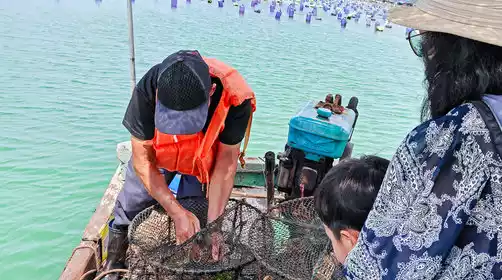 Afterwards, led by the captain, we will take a boat to the offshore fishing raft base for a sea fishing experience. Along the way, we will visit the offshore fishing rafts, cast nets to catch fish, and collect the crab cages after collecting the fishing nets.