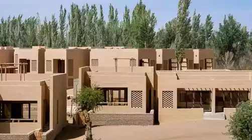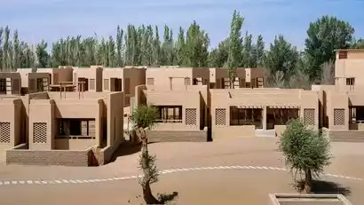 Dunhuang Resort is located at the foot of Mingsha Mountain in Dunhuang. The hotel's design reflects the style of ancient manor houses, with large roofs, long wooden corridors, elegant furniture from the late Tang, Ming, and Qing dynasties, and a northwestern-style enclosed courtyard house built primarily of stone and mud, complete with earthen walls. These elements imbue the hotel with traditional and local characteristics.
