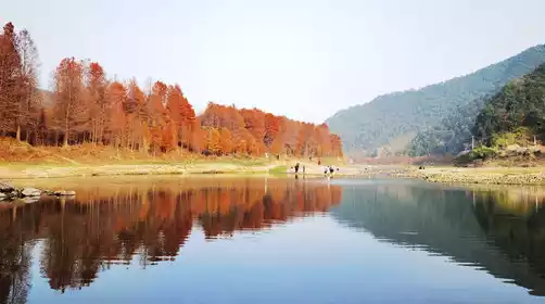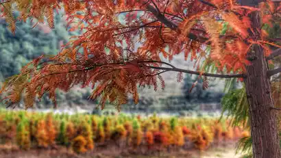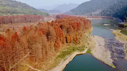 [13:30] : After driving along the mountain road for about an hour and a half, we arrived at the "Zhejiang Kanas" - the redwood forest. We got off the bus and followed the team leader for a leisurely stroll. Suddenly, a fiery redwood forest appeared in front of us. Everyone exclaimed that there was such a spectacular autumn scenery in this valley. It was like being in Kanas. The fiery redwoods, even the grass was covered with red leaves, like a fairy tale world. Everyone was crazy about taking pictures and posing. Then we took a small path to climb up and look down. Looking at the redwoods from a high place was a different feeling. Under the guidance of the staff, we began to go deep into the valley, where there was a larger redwood forest.