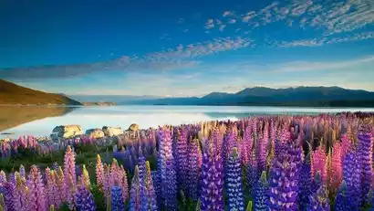 A three-hour drive from Christchurch brings you to Lake Tekapo, a South Island destination for stargazing and flower viewing. Surrounded by the majestic Southern Alps, the tranquil lake shimmers with a faint milky blue. The sky, seemingly unobstructed by the atmosphere, reflects the lake's incredibly clear blue. Snow-capped mountaintops in the distance create a breathtaking canvas, making you feel like you've stepped right into a painting. From November to January each year, colorful lupines bloom along the lakeshore and on Mount John, creating postcard-worthy images with every click of the shutter.