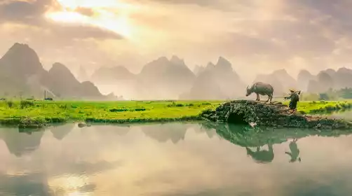 Here, you'll find classic karst mountains, small bridges and flowing water shrouded in mist, farmhouses reminiscent of Tao Yuanming's works, and villagers plowing their fields with oxen. At sunrise, the sun and its rays, reflected in the ponds between the fields, create a beauty reminiscent of the artistic conception depicted in ancient poetry. The farmers and oxen were specially arranged to collaborate on the creation of this work.