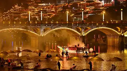 Xuan'en's nightscape is particularly stunning. As dusk falls, the riverbanks, starting from Wenlan Bridge, are ablaze with lights. The night view of Xinglong Old Street, known as the Little Hongya Cave, and the winding bamboo rafts in the Gongshui River, like a swimming dragon, are also a truly spectacular sight. During the Spring Festival, a lively lantern festival is held here, with large red lanterns hanging high, creating a festive atmosphere. There are also markets and snack streets, and you can enjoy the local specialty, grilled live fish, which is crispy on the outside and tender on the inside, and is incredibly delicious.