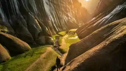 The canyon's bottom is moist, fertile, and covered with green grass. Walking through the valley floor feels like walking on the pristine land where dinosaurs roamed in ancient times. From the valley floor, you can admire the spectacular Danxia landforms on both sides of the canyon. The crimson rocks exude a mysterious and sacred aura.