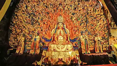 At 12:10 PM, your guide will lead you to the official Baoding Mountain Rock Carvings tour. Admire the large-scale rock carvings of my country's late Tang Dynasty. The carvings on Baoding Mountain's cliffs date back to the Southern Song Dynasty. Within a 500-meter radius, Buddhist statues are carved throughout the rock. Famous figures include the Six Paths of Reincarnation, the Great Treasure Pavilion, the Two Holy Images of Huayan, and the Thousand-Armed Guanyin. This is a treasure trove of Chinese grotto art, integrating Buddhism, Confucianism, and Taoism. UNESCO has designated it a monument to Chinese grotto art. After your tour, visit Shengshou Temple at the mountain gate. Shengshou Temple, also known as Baoding Shengshou Temple, is located 15 kilometers northeast of Dazu District, Chongqing, to the right of the Big Buddha Bay on Baoding Mountain. Built during the Chunxi reign of the Southern Song Dynasty, it was a Tantric Zen monastery founded by the renowned monk Zhao Zhifeng. Originally known as Wufo Cliff, it took on its current name after expansion. The original temple has been abandoned, and the remaining buildings date back to the Ming and Qing dynasties.