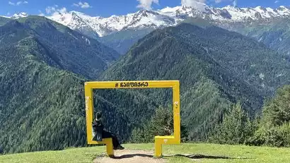 In the afternoon, we returned to Mestia and headed to the secret filming location of Heshkiri. Here, the internet-famous flying swing serves as the starting point, with the snow-capped mountains surrounding us as the backdrop, allowing us to capture the magnificent scenery of Mestia. There's no time limit, so tourists can take as many photos as they want. In spring, the mountains are covered in blooming wildflowers, making for a great photo opportunity.