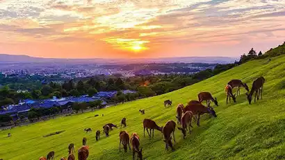 Afterwards, we headed to photograph the sunset at Wakakusa Mountain. The scenery here features a broad grassy slope, with rolling hills in the distance, Nara Castle nestled among cherry blossoms, and deer strolling leisurely nearby. The scenery is breathtakingly beautiful under the twilight.