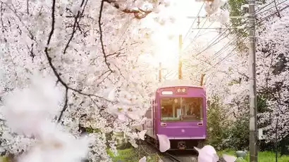 This afternoon, we'll head to the Randen Line to photograph the cherry blossoms. The Randen Line is Kyoto's only continuously operating streetcar, boasting a century-long history. Every spring, when the cherry blossoms are in full bloom, the originally green tunnel transforms into a pale pink. This is the famous Randen Line cherry blossom tunnel, attracting numerous tourists and photography enthusiasts year after year. Many postcard images of trains and cherry blossoms feature here, and we'll enjoy capturing those postcard-worthy scenes!