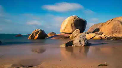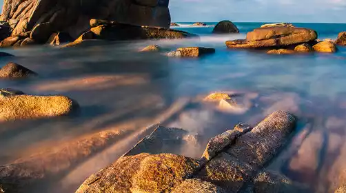 At the mouth of the Wanquan River in Boao, a cluster of reefs juts out from the beach. Because most of the rocks are pink, they're known as "Red Stone Beach." These red rocks, scattered across a range of about five to six hundred meters, are mostly long and narrow, rising evenly from the sea. Clusters and individual rocks stand tall against the silvery waves, weathering the daily tidal surges and the ravages of wind, sun, and rain, adorning the beautiful coastline. In the evening, the sea, bathed in the setting sun, shimmers in a golden hue. Slow-motion photography, like mist and smoke, surrounds the reefs, creating a fairyland-like scene.