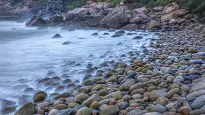 Dahuajiao is formed by two mountain ranges, the Front and Back, with a canyon nearly 100 meters wide between them. The arched pebble beach, densely packed with pebbles, dominates the bay. Some are as big as a bowl, some as small as an egg, some round, some flat, each smooth and translucent. Glistening in the morning sun, they shimmer and shimmer, a dazzling display of blue, red, green, and yellow, a dazzling spectacle that is both captivating and captivating. On the other side of the mountain lies a sheltered bay, its soft sandy beach whispering to the gentle waves. Rows of small fishing boats bob along the shore. The two beaches, separated by a single mountain, are so distinct that one can't help but marvel at the wonders of nature.