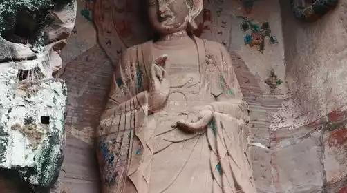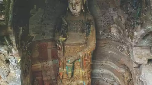 Visit the Yuanjue Cave Stone Carving Scenic Area, where there are 103 existing caves and niches, and 1,933 statues. Most of the works are from the Tang, Five Dynasties, and Song dynasties. The three statues of Sakyamuni, Jingping Guanyin, and Padmasambhava, which are over 6 meters high, are particularly spectacular.