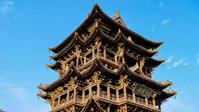 Feiyun Tower, located within the Dongyue Temple in Wanrong County, Shanxi Province, boasts a pure wooden structure with mortise and tenon joints, large and small, jutting into the same space as the Yingxian Wooden Pagoda. It is known as "China's No. 1 Wooden Tower." Built in the Yuan and Ming Dynasty styles, the tower stands 23.19 meters tall and features densely decorated brackets. It appears three stories from the outside, but actually has five floors inside, totaling approximately 23 meters. Feiyun Tower is a representative example of the architectural complex within the Jiedian Dongyue Temple. A local proverb evokes the saying, "Wanrong boasts a Jiedian Tower, half of which is stuck in the sky."