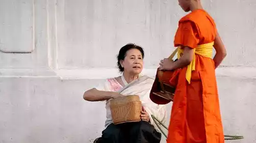 There's a sacred tradition in Luang Prabang: Every morning, monks line up, carrying their alms bowls and walking down the street. As the first rays of sunlight illuminate the golden temple dome, yellow robes appear from afar. The barefoot monks slowly approach, while locals prepare food and fruits and vegetables, kneel, hands clasped in reverent prayer, and wait quietly by the roadside. When the monks approach, the donor reverently places rice into their alms bowls. The monks then bow, chant, and depart. This daily ritual is known locally as "Morning Alms Giving" (no refund if you don't participate). This morning, we'll join the almsgivers and experience the pure joy of this process.