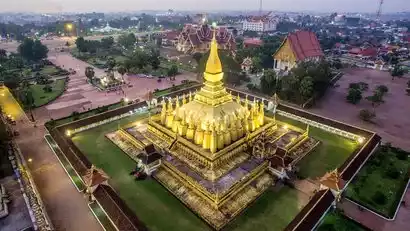 In the afternoon, we'll visit Pha That Luang, a pagoda deeply valued by the Laotian people. It features on the Laotian national emblem, a symbol shared by both Buddhism and the Laotian state. Built in 1556, Pha That Luang is one of the most magnificent of Laotian pagodas. Covered entirely in solid gold, it can be seen from afar even on cloudy days. Legend has it that the temple's sanctity was established by the burial of Buddha's hair and sternum relics in the 3rd century BC. The three-story pagoda stands 45 meters high and 54 meters wide. Its golden hue is strikingly beautiful against the backdrop of a blue sky and white clouds.