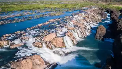 The most famous waterfall on Dongkuo Island is Songdapami Waterfall, also known as Lipi Waterfall. Despite its low drop, the waterfall stretches over ten kilometers wide. It is composed of countless cascading water outlets, creating a cascading waterfall. Locals call it the "Nine-Layered Waterfall." The water rushes over the rocks, surrounded by lush greenery, creating a picturesque scene.