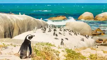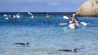 After breakfast, we embark on our first important experience: a kayaking experience at the harbor near the penguin sanctuary. Here, we'll enjoy the breathtaking views of the bay and a chance to see Simon's Town's famous penguins. This will give us a close-up experience of Cape Town kayaking, and with a chance to see fur seals. We'll then drive to the Penguin Sanctuary for our official visit to the renowned South African spot-billed penguins. Are penguins only found in Antarctica? Not really! In South Africa, these penguins are called spotted penguins, and thousands of them waddle about or frolic freely on the beach.