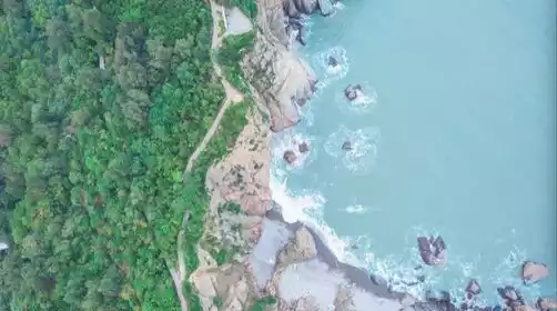 Around 9:00 AM, we set out on Xiaojing Mountain, a hidden gem of a time-honored hiking destination. Here, grotesque rocks crisscross the landscape, and the sound of pine trees echoes like a song. A ridgeline trail connects Xiaojing Mountain to Turtle Rock, offering a delightful and ever-changing scenery with every step. This is a touch of elegance amidst the peaks of southern Zhejiang's islands. The trail winds upward, passing through peculiar rock formations like Yuanbao Peak and Immortal's Footprints, like stepping into a natural island labyrinth. In early summer, crimson leaves adorn the pines in the mountains, and the sea breeze, carrying a salty fragrance, caresses our faces. From the summit, the view reveals Turtle Rock Peak, like a giant tortoise crouching in the East China Sea, a striking contrast against the azure blue.