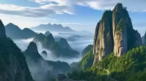 Around 3:30 PM, we arrived at the Nanxi River. Our first stop was Daruoyan. Nestled in the Yandang Mountains, this area boasts majestic mountains and picturesque waters, steep peaks and precipitous cliffs, with the Twelve Stone Pillar Peaks rising from the ground into the clouds. The trail is well-maintained, with numerous viewing platforms offering breathtaking scenery, making it feel like walking among the clouds. We chatted, took photos, and soon reached the summit. Then, descending the mountainside, we arrived at the Thousand-foot Three-Fold Feihong Waterfall, resembling the breath of a giant dragon, a truly breathtaking experience!