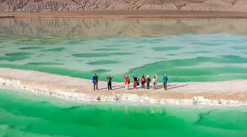 We then continued west to the emerald green salt lake, Emerald Lake. This former mining area of the Da Qaidam Chemical Plant's salt lake mining team creates a vibrant palette of colors due to varying mineral concentrations. On clear days, the mirror-like surface of the lake reflects the blue sky, white clouds, and snow-capped peaks, creating a fairyland-like experience.