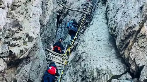 Climbing the ancient wooden ladder is thrilling! Passing by the "Ten Thousand Foot Ladder" (wooden and iron ladders) built by pilgrims is thrilling yet safe and reliable!