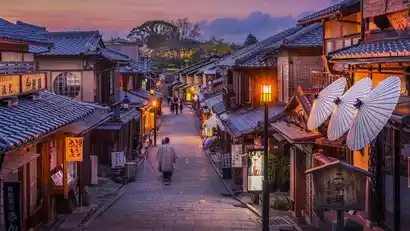 Ninenzaka and Sannenzaka, located just outside Kiyomizu-dera Temple, are uniquely Kyoto-style slopes designated as an Important Traditional Buildings Preservation Area. Flanking the slopes are charming, ancient Japanese buildings, offering a rich and vibrant atmosphere. The area is also home to a dazzling array of delicious food, paper fans, dolls, chopsticks, and other handicrafts.