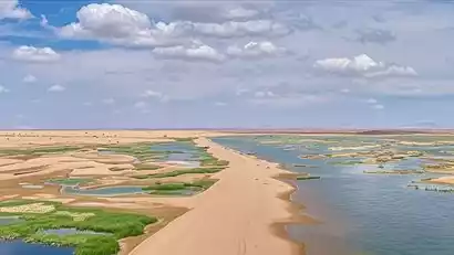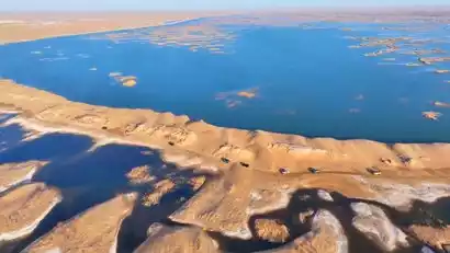 Breakfast at the hotel restaurant followed by a bus to the Desert Thousand Island Lake. Since there are no restaurants near the lake, resupply at Jirigalangtu Town along the way. Here, the lake shimmers with shimmering sand, and the sky and water intersect. The Yellow River flows into the desert, precipitating the sediment over time, leaving it crystal clear, like a series of blue gemstones, creating the spectacular "Desert Thousand Island" spectacle.