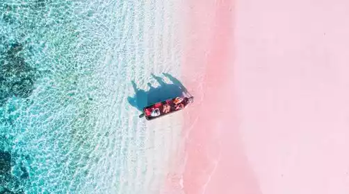 Afterward, we'll visit another highlight of this trip, the Pink Beach, where tourists can stroll along the pink sand and splash in the ocean. Indonesia boasts a unique pink beach in Southeast Asia, boasting clear water and fine sand. The beach's pink color is attributed to the abundance of red coral on the seabed. Years of erosion by the sea have created a rich pink sand, which washes onto the shore. Over time, the beach is filled with red coral sand, giving it a vibrant pink hue. Taking photos here will captivate your senses from every angle!