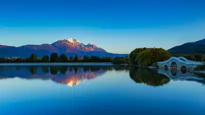 Get up early in the morning and go to Qingxi Reservoir to wait and photograph the sunrise over Yulong Snow Mountain, recording the moment when the first ray of sunlight illuminates the peak of the snow-capped mountain.