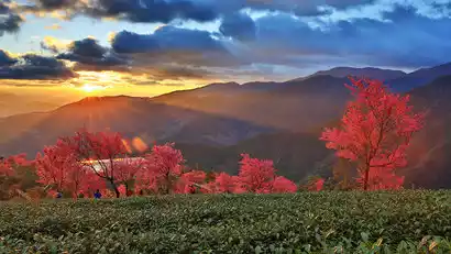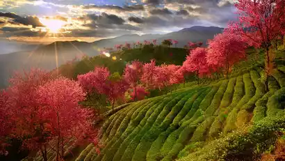 In the early morning, I photographed the sunrise, sea of clouds and morning mist of the winter cherry blossoms in Wuliang Mountain. The misty clouds and bright red winter cherry blossoms bloomed on the green tea mountains. This is early spring in Yunnan!