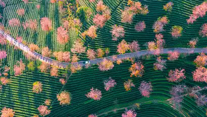 Afterward, we departed and drove to Wuliangshan Cherry Blossom Valley. As we entered the valley, we were captivated by the vibrant colors of cherry blossoms amidst the green fields. Entering the tea garden, the trees covered in cherry blossoms, their tender leaves barely visible, are a sight that always captivates photography enthusiasts. After checking in, we were free to take photos and explore the area.